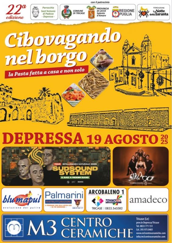 CIBOVAGANDO NEL BORGO – La sagra della pasta fatta a casa e non solo…Il 19 agosto 2025 si realizzerà la XXII° edizione della storica sagra di Depressa “CIBOVAGANDO NEL BORGO – La pasta fatta a casa e non solo”, a cura della Parrocchia Sant’Antonio da Padova che si propone di promuovere il territorio e far degustare le specialità enogastronomiche locali .