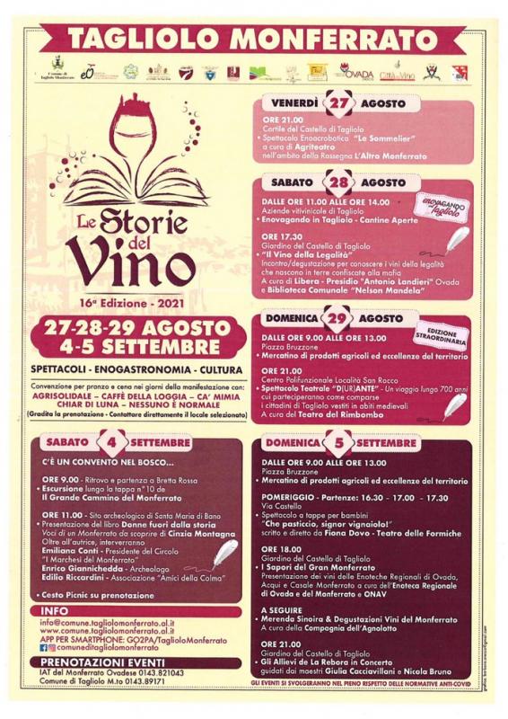 dal 27 al 29 Agosto e dal 4 al 5 Settembre 2021 si terrà a Tagliolo Monferrato la 16ima edizione di "Le Storie del Vino"