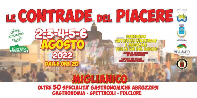 Dal 2 al 6 agosto 2022 a Miglianico (CH) Le "contrade del piacere" è una tradizionale manifestazione dedicata alla degustazione dei piatti tipici locali miglianichesi, organizzata dalla Pro loco e si tiene nel centro storico di Miglianico. Ogni contrada allestisce stand gastronomici in cui è possibile assaporare gli antichi sapori dal gusto genuino dei piatti tipici locali. Nei stand si potranno gustare oltre 50 specialità abruzzesi, preparate con i prodotti a km zero della terra miglianichese e della vallata del Foro. Gli stand saranno aperti dalle ore 20,30 fino a tarda notte. Musica, e artisti caratterizzeranno le serate