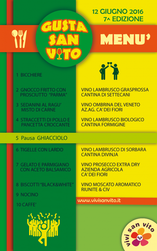 Gustasanvito 2016. Domenica 12 giugno 2016 a San Vito di Spilamberto (MO) si svolge la magnalonga enogastronomica immersa nel verde delle campagne locali alla scoperta della cucina nostrana accompagnata da buona musica.