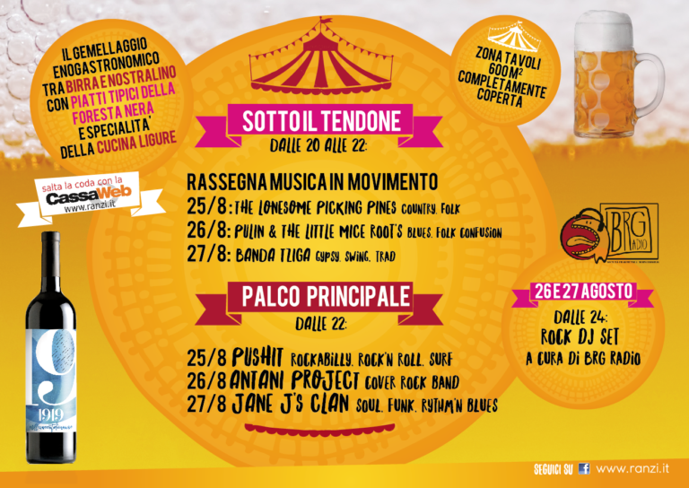 I Birrai tedeschi porteranno direttamente dalla Germania fiumi di birra, wurstel e altre gustosissime specialità della Foresta Nera, mentre i “cuochi” del Circolo Giovane Ranzi rielaboreranno per l’occasione alcuni dei piatti tipici della nostra tradizione.