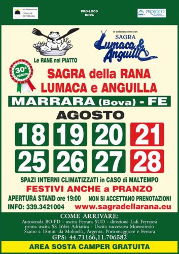 La nuova edizione di Le Rane nel piatto, la sagra di Bova di Marrara (FE), si svolge nei giorni 18/19/20/21 - 25/26/27/28 Agosto 2022.