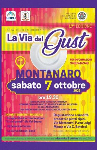 L'Associazione Turistica Pro Loco, il Comune di Montanaro ed Assessorato alla Cultura in collaborazione con: produttori locali, associazioni, cantoni e attività ristorative presenta "La Via Del Gust ". La kermesse enogastronomica giunge alla sua diciottesima edizione e si terrà Sabato 05 Ottobre 2024 nel centro del paese con degustazioni e vendita prodotti e piatti tipici del territorio, intrattenimento musicale.