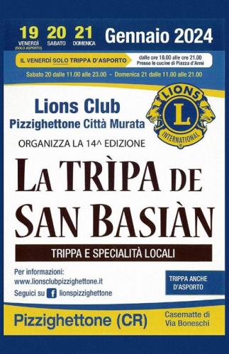 Lions Club Pizzighettone Città Murata organizza nelle Casematte di via Boneschi a Pizzighettone la XlV edizione de 'La Trìpa de San Basiàn' con possibilità di degustare trippa (anche da asporto) e specialità locali.