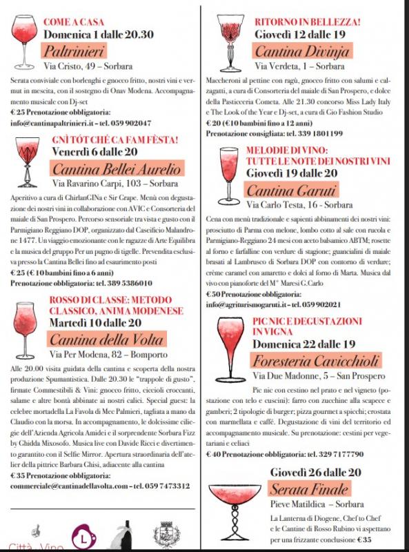 Nel mese di giugno Cantina Paltrinieri, Cantina Bellei, Cantina della Volta, Cantina Divinja, Cantina Garuti e Foresteria Cavicchioli apriranno le loro porte per accogliere gli appassionati di vino e gastronomia.