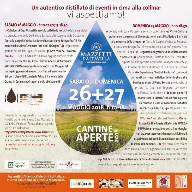 Sabato 26 e domenica 27 maggio Mazzetti d’Altavilla la più storica Distilleria del Nord-Ovest aderisce a “Cantine Aperte 2018”, il format promosso dal Movimento Turismo del Vino Piemonte, e ospiterà una due giorni di celebrazione del Distillato 100% piemontese, che sta vivendo un momento di vivace riscoperta e valorizzazione con un pubblico sempre più vario che si affaccia alla tradizione, con gli occhi del presente.