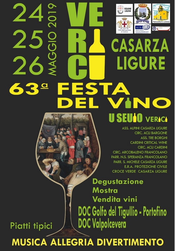 Venerdì 24, Sabato 25 e Domenica 26 Maggio 2019 si svolge la 63a edizione della Festa del Vino di Verici, frazione del Comune di Casarza Ligure.