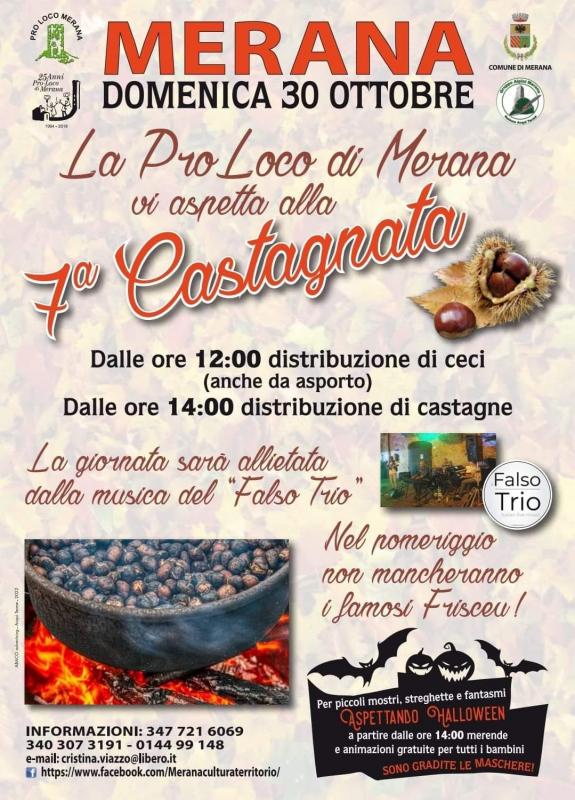 Castagnata a Merana 30 Ottobre 2022 Stand gastronomici, distribuzione ceci, castagne,e frisceu, nel pomeriggiodall1 14:00 aspettando Halloween , distribuzione di merendee animazione per i bambini.