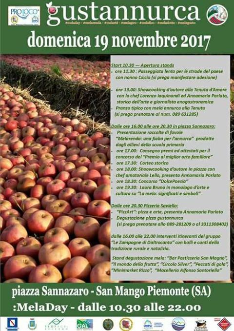 Tutto è pronto per il giorno della mela, che si terrà domenica19 novembre a San Mango Piemonte. Il MelaDay è una iniziativa di “Gustannurca”, evento che la Pro Loco di San Mango Piemonte promuove a tutela e valorizzazione delle eccellenze agroalimentari picentine, dalla mela annurca alle altre risorse tipiche territoriali, espressioni di qualità della nostra identità culturale ed ambientale, ingredienti base per una sana e corretta alimentazione ed uno stile di vita più responsabile e naturale. Mancano sette giorni a domenica 19 e si ha la sensazione che Gustannurca, progetto contenitore delle iniziative MelaDay Melarenda Melarte' Melagiro Melafico Meladotto Melagusto, quest'anno farà un salto di qualità determinante e gratificante, tanto da incidere una traccia indelebile negli annali della memoria sanmanghese.