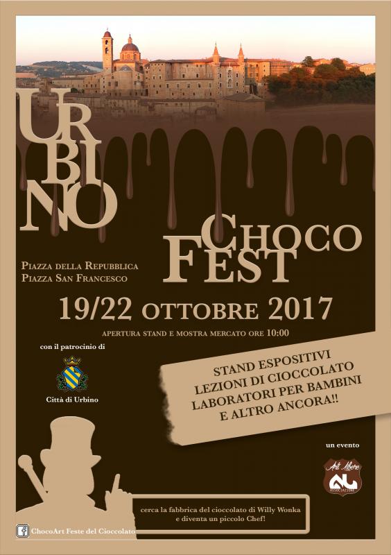"Urbino Choco Fest", è un dolce appuntamento per tutti gli appassionati del "cibo degli dei", organizzato dall' Associazione Culturale Arti Libere, con il patrocinio del Comune di Urbino è la grande Festa del cioccolato artigianale in programma ad Urbino dal 19 al 22 ottobre in Piazza della Repubblica e in Piazza San Francesco. La festa del cioccolato sarà un' occasione ghiotta per farsi tentare dalle raffinate creazioni al cioccolato frutto dell'estro dei maestri cioccolatieri ChocoArt Feste del Cioccolato è: cioccolatini e praline, tavolette, creme e liquori al cioccolato, divertenti sculture come topolini, coccinelle, scarpette, utensili per la casa, telefonini, che sembrano animarsi, che saranno in degustazione e vendita presso gli stand sempre aperti dalle 10 alle 20. Ma per tutto il weekend, ci sarà anche la possibilità di immergersi nel mondo del cioccolato di altissima qualità lavorato artigianalmente, grazie alle tante attività didattiche previste nella Fabbrica del Cioccolato allestita in Piazza San Francesco, la struttura che accoglierà il pubblico con la presenza di Willy Wonka che porterà i più piccoli in dolci creazioni tutte da gustare.