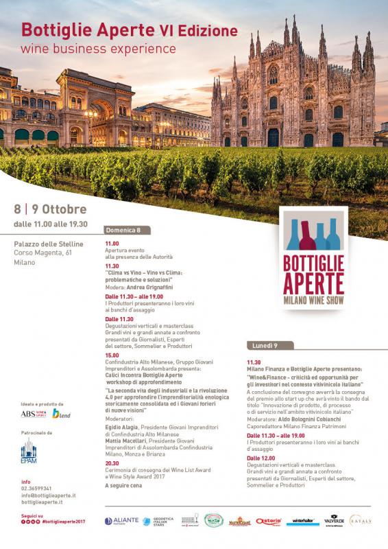 Il pomeriggio di domenica 8 ottobre (alle 15) Confindustria Alto Milanese - Gruppo Giovani Imprenditori e Assolombardo presenteranno “Calici incontra Bottiglie Aperte”, due momenti di incontro che porranno l’attenzione sull’imprenditorialità enologica storicamente consolidata e su quella giovanile foriera di nuove visioni. Nei due workshop – “La seconda vita degli imprenditori” e “Imprese 2.0” – saranno coinvolti giovani imprenditori impegnati nel settore vino, sia produttivo sia dei servizi.