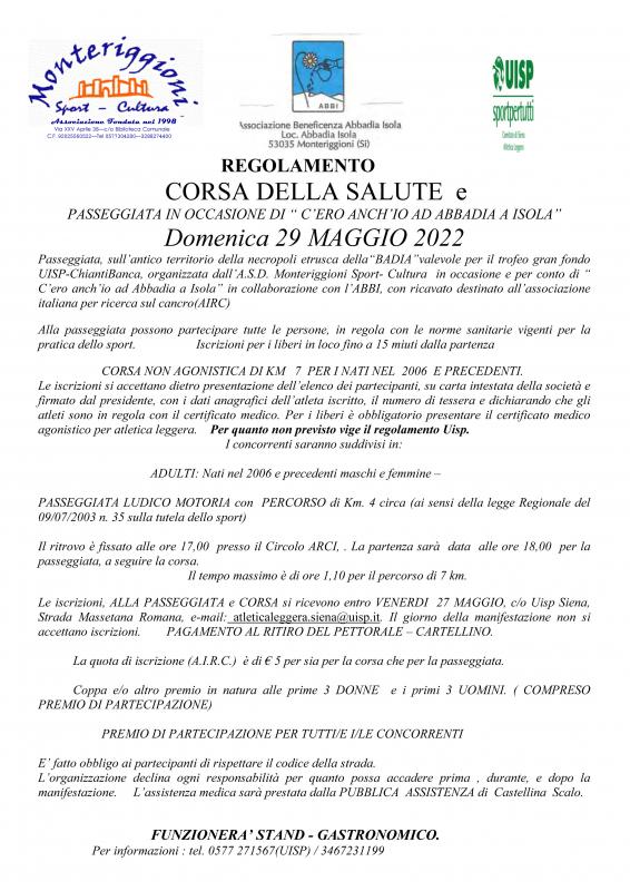 Domenica 29 maggio, nell'ambito della stessa manifestazione, "Corsa della salute" e passeggiata nei dintorni del borgo promosse dall'associazione "Monteriggioni sport e cultura" (regolamento in allegato).