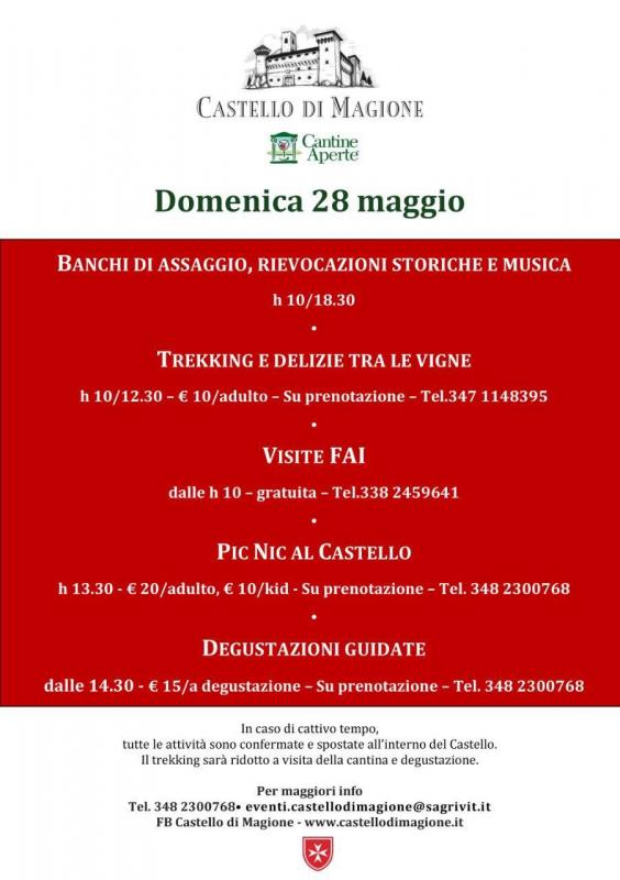 Domenica 28 maggio, dalle 10 alle 18.30, nell'ambito dell'iniziativa Cantine Aperte, il Castello di Magione, magnifico maniero del 1100, aprirà al pubblico con banchi di assaggi di vino ed olio prodotti dall'azienda del Castello. Sarà possibile degustare anche vini delle altre due tenute dell’azienda: i friulani di Rocca Bernarda ed il prosecco DOCG di Villa Giustiniani. Il tutto, immersi nella musica del Set Valigie: sottofondo musicale unico in cui consolle e casse sono oggetti d’arte, grazie ad antichi bauli e valigie anni ’50.