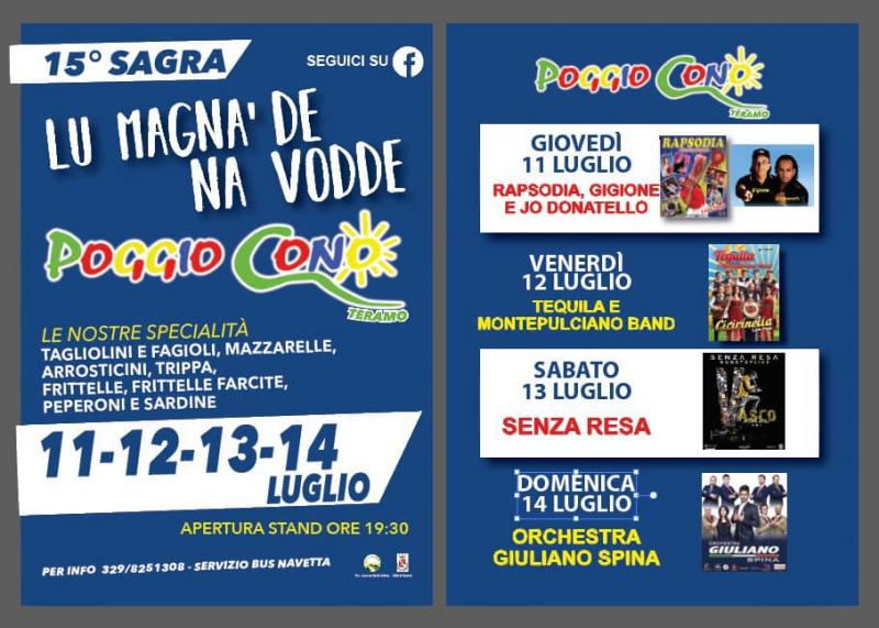 Mazzarelle, tagliolini e fagioli, trippa, peperoni e sarde fritte, frittelle semplici e farcite, arrosticini! I migliori piatti della tradizione gastronomica teramana saranno protagonisti dal 11 al 14 luglio 2019 a Poggio Cono (Teramo), della 15° edizione della sagra "Lu Magnà de na Vodde", organizzato dalla Pro-Loco "Le Verdi Colline".