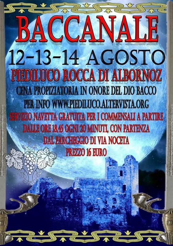 Da Venerdì 12 a Domenica 14 Agosto 2015 torna a Piediluco il Baccanale, cena propiziatoria in onore del Dio Bacco, all'interno della Rocca di Albornoz, che domina il paese in cima al monte Luco.