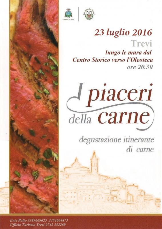 Il 23 luglio dalle ore 20.30 a Trevi si rinnova l'appuntamento con 'I Piaceri della Carne', quest'anno completamente rivisitato, per poter accontentare le tante richieste ad allargare la degustazione ai vari tipi di carne, e dare anche seguito ai suggerimenti di chi di carne se ne intende. Tanta, tanta carne al fuoco: Agnello, Maiale, Vitello, Pecora, una variegata scelta di carni che sicuramente andranno a soddisfare gli appassionati del buon mangiare. Un rendez-vous molto atteso e apprezzato, ormai immancabile anche per gli esperti e intenditori del settore. Le pregiate carni la faranno da padrone coniugando le eccellenze del territorio e i deliziosi vini delle colline circostanti. L'Ente Palio dei Terzieri vi aspetta per una splendida serata...lungo le antiche mura medievali che abbracciano la città...tra uno splendido panorama che affaccia sulla valle umbra, musica e buona cucina, eccellenze locali e non solo. Una degustazione itinerante in un percorso originale con musica dal vivo in cui potrete assaporare il meglio della nostra arte culinaria, verdure e prodotti della campagna trevana, olio extravergine di oliva d.o.p. e le ottime Carni sapientemente lavorate, abbinate ai vini della Cantina Caprai. Un connubio di sapori, arte, profumi.