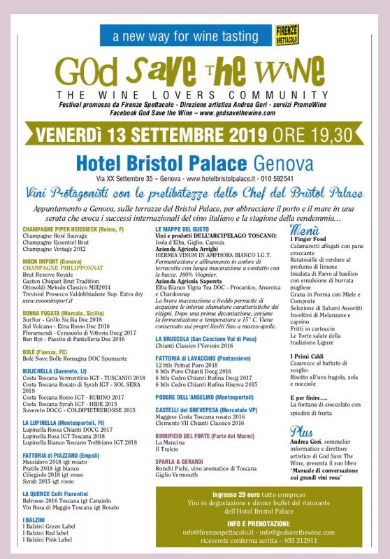 Una serata dedicata al piacere dei sensi, al recupero di un approccio istintivo e libero al vino. God Save The Wine torna al Bristol Palace, nell’esclusivo palazzo liberty nel cuore di Genova, da sempre sede e cornice per eventi importanti di grande richiamo, che apre le sue sale e la sua terrazza.