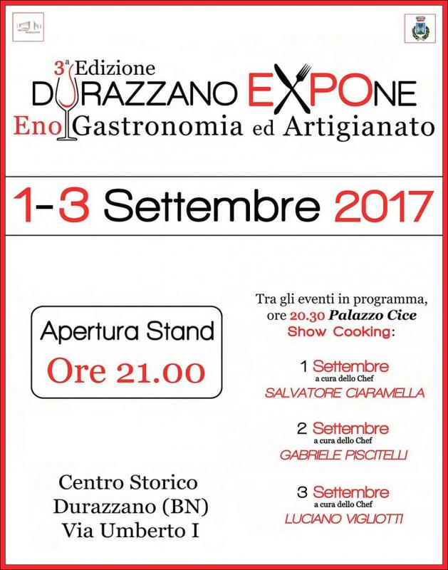 Durazzano Expone - Enogastronomia ed Artigianato, è una manifestazione che si terrà a Durazzano (BN) dal 1 al 3 settembre 2017. La manifestazione è alla sua terza edizione e si pone il duplice obiettivo di promuovere le realtà enogastronomiche sannite nonché l'artigianato artistico durazzanese.