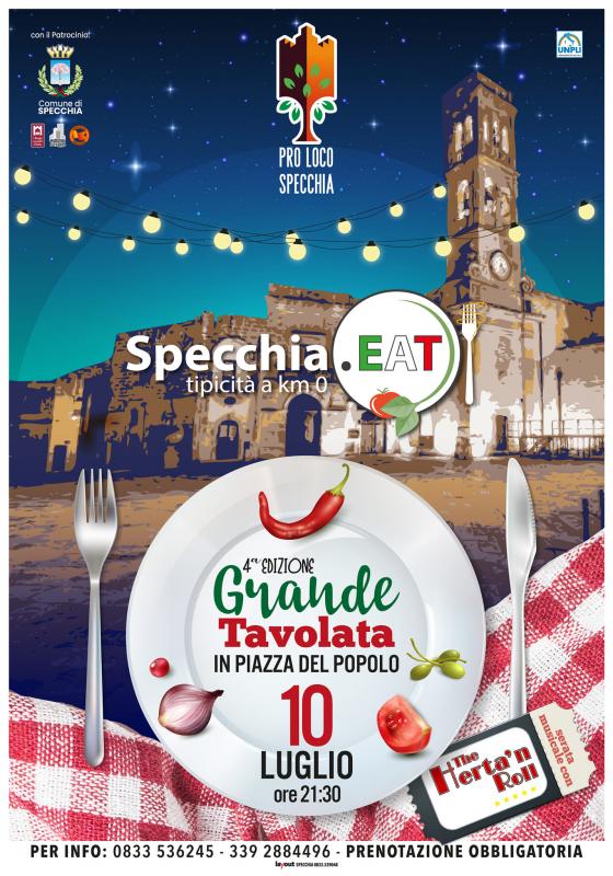 Specchia.EAT è una grande cena all’aperto, un’enorme e suggestiva tavolata nel centro storico del borgo in Piazza del Popolo. attorno alla quale specchiesi e turisti potranno deliziarsi di prodotti tipici locali.