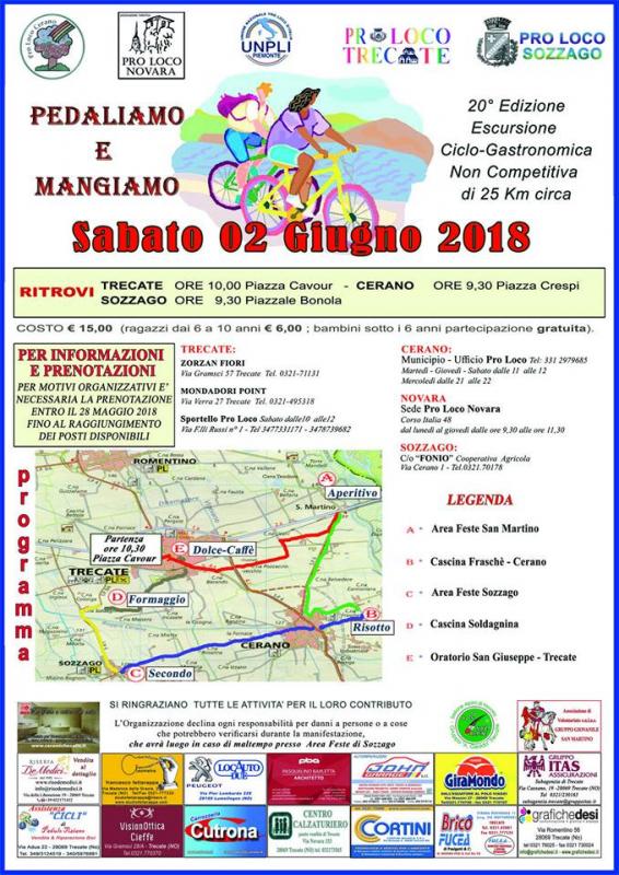 Sabato 2 giugno 2018 torna Pedaliamo e Mangiamo a Trecate (NO), la 20^ edizione dell'Escursione Ciclo-Gastronomica non competitiva di 25 km.