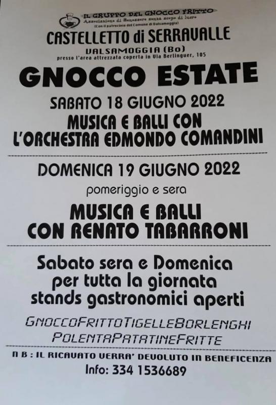 Il 18 e 19 giugno 2022 torna l'evento enogastronomico Gnocco Estate a Castello di Serravalle (BO).