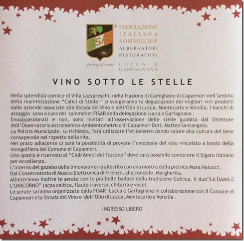 Nella splendida cornice di Villa Lazzareschi, nella frazione di Camigliano di Capannori nell’ambito della manifestazione “Calici di Stelle “si svolgeranno le degustazioni dei migliori vini prodotti dalle aziende associate alla Strada del Vino e dell’Olio di Lucca,Montecarlo e Versilia. I banchi di assaggio sono a cura dei sommelier FISAR della delegazione Lucca e Garfa-