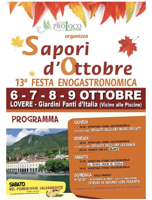 La Nuova ProLoco Lovere organizza l' edizione della ''Sapori d'Ottobre'', festa enogastronomica con servizio di cucina tipica locale e intrattenimento musicale.
