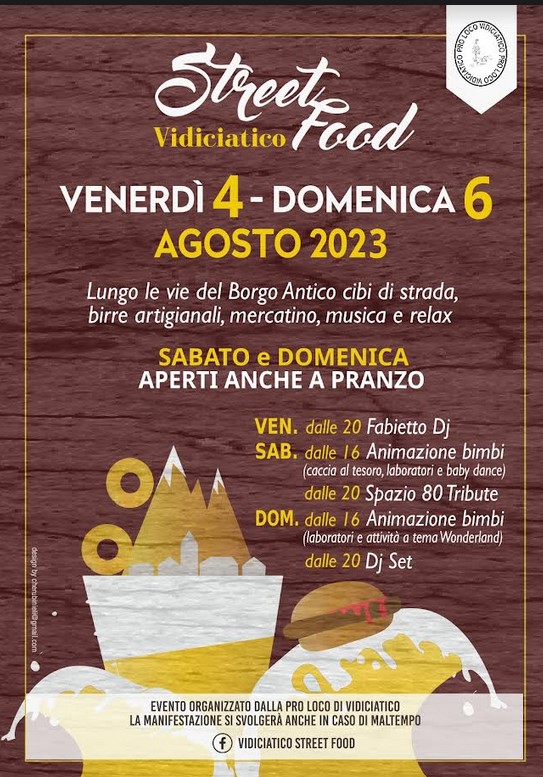 Il VIDICIATICO STREET FOOD è un evento organizzato dalla Pro Loco di Vidiciatico. La manifestazione si svolgerà anche in caso di maltempo.
