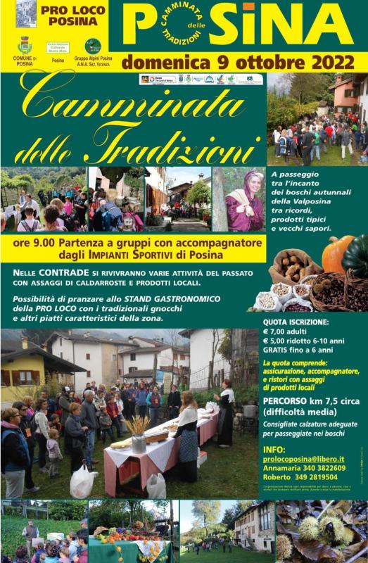 Camminata delle Tradizioni a Posina 9 ottobre 2022, percorso gastronomico con degustazioni di prodotti tipici locali, allo stand gastronomico possibilita di pranzare con i tradizionali gnocchi