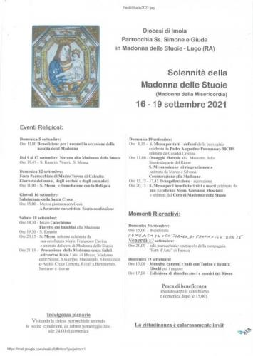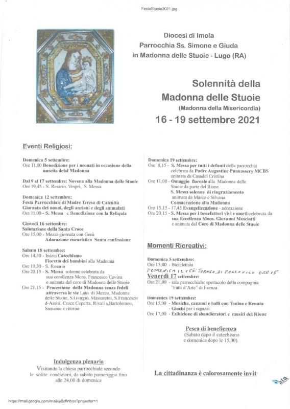 Da venerdì 17 a domenica 19 settembre si svolgerà presso la parrocchia Ss. Simone e Giuda in Madonna delle Stuoie di Lugo (RA) la festa Parrocchiale.