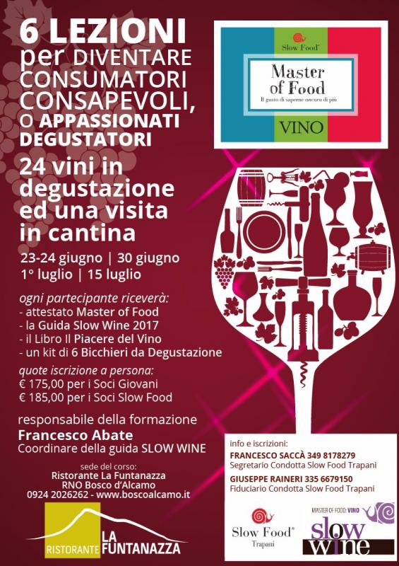 Sei Lezioni per diventare consumatori consapevoli, o professionisti del Vino, la formazione sarà tenuta da Francesco Abate, Coordinatore Sicilia della guida SLOW WINE, il corso prevede 24 vini in degustazione selezionati da Slow Food ed una visita in cantina, ogni partecipante riceverà, oltre all’attestato di Master Of Food, la Guida Slow Wine 2017 il Libro Il Piacere del Vino ed un Kit di 6 Bicchieri da Degustazione.