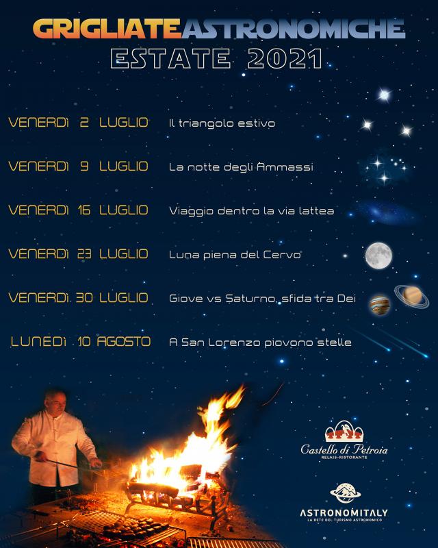 Al Castello di Petroia, dopo i successi di pubblico degli ultimi 6 anni e gli importanti riconoscimenti ricevuti (da ultimo il premio italive per il miglior evento enogastronomico d’Italia) anche quest’anno tornano tutti i Venerdì di Luglio ed il 10 Agosto LE GRIGLIATE ASTRONOMICHE.