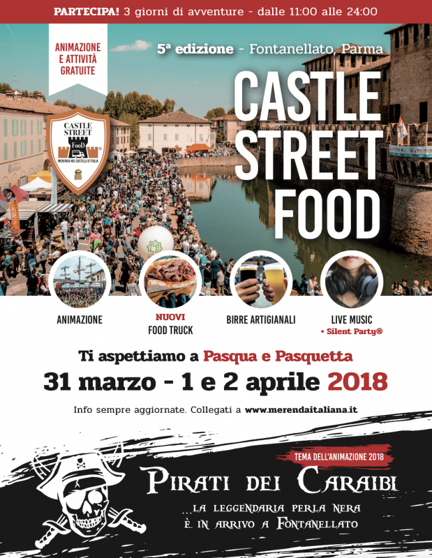 Una nuova edizione imperdibile di "Castle Street Food" è alle porte. Da sabato 31 al lunedì 2 aprile 2018, weekend di Pasqua e Pasquetta, al Castello di Fontanellato (PR) ci sarà cibo di strada, musica, giochi e una grande discoteca all'aperto fino a tarda sera, per una festa di tre giorni.