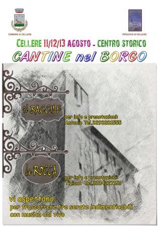 I giorni 11-12-13 Agosto 2016, presso il centro storico di Cellere apriranno le Cantine nel Borgo, il Baccile e la Rocca. Vi apettiamo per degustare un menù tipico della nostra tradizione, il tutto allietato da musica live.
