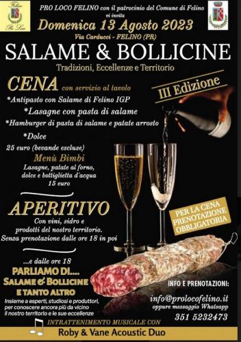 Ecco il programma di "SALAME & BOLLICINE" 2023, l'appuntamento organizzato da Pro loco Felino con il patrocinio del Comune di Felino, giunto alla 3à edizione, che si terrà