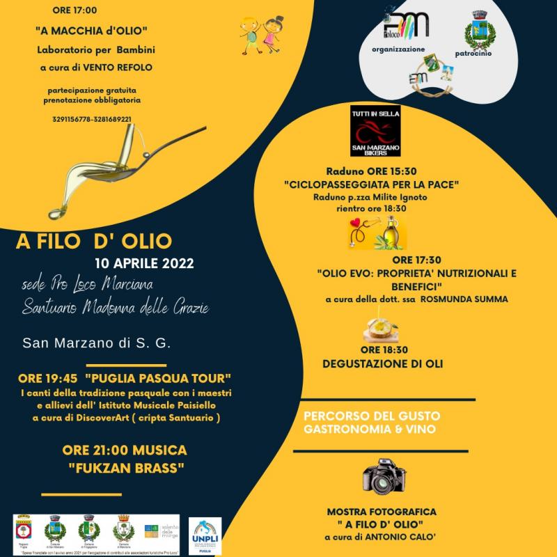 Si svolgerà domenica 10 aprile, nel Santuario Madonna delle Grazie e nella sede della Pro Loco Marciana, a San Marzano di San Giuseppe (Taranto), la terza tappa del progetto “A Filo d’Olio”.