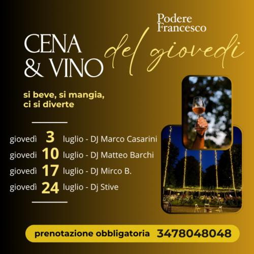 “Cena & Vino del giovedì” è il nome della rassegna che animerà il mese di luglio: ogni giovedì sera alle 20:00 (3, 10, 17 e 24 luglio 2025) gli ospiti potranno vivere un’esperienza unica all’aperto, immersi nel verde del podere situato in Strada Reatino 23, a Novellara (RE).