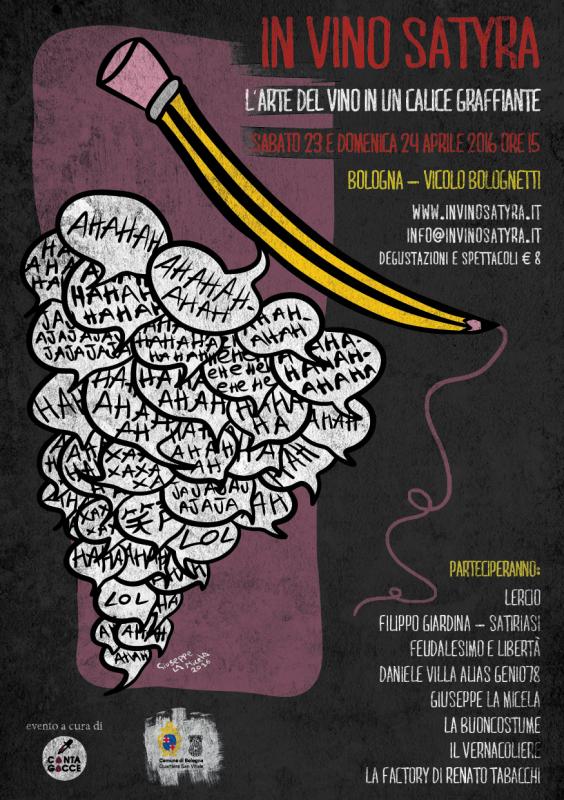 In Vino Satyra è un festival che abbina la corposa esperienza sensoriale legata alla degustazione del vino con una portata altrettanto gustosa e pungente: la Satira. Ideato e realizzato dall’Associazione ContaGocce, il festival propone un’accurata selezione di stimati rappresentanti della produzione vitivinicola e della satira, promuovendo il connubio fra queste arti per stimolare l’incontro, la conoscenza e la mutua celebrazione. Un appuntamento servito al pubblico nella suggestiva cornice del Quadriportico di Vicolo Bolognetti dal 23 al 24 aprile 2016. Protagonisti della manifestazione saranno i vignaioli, gli artisti di satira e il pubblico, invitato a interagire con i produttori e con gli autori per tutta la durata dell’evento.
