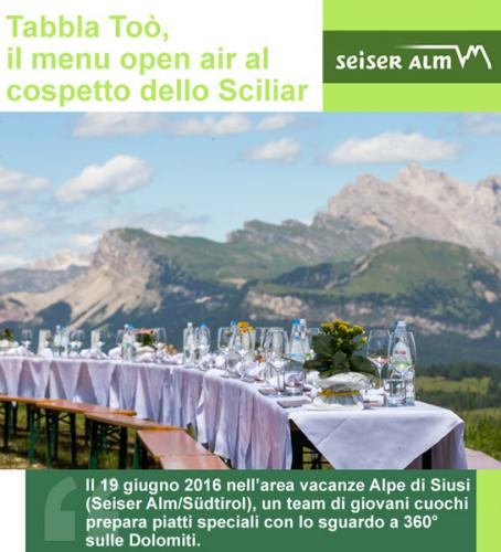 Giovani cuochi cucinano piatti d’autore sotto il cielo alpino, mentre le Dolomiti (Patrimonio Mondiale UNESCO) stanno a guardare. Gli ospiti si accomodano seduti sulla lunga tavolata che costeggia il lago vicino al Punta d’Oro – all’Alpe di Siusi (Seiser Alm/Südtirol) – e che si affaccia come se fosse su un balcone naturale sul paesaggio di Sassolungo e Sassopiatto, che si divertono a riflettere le loro immagini nell’acqua. Un panorama fatto di praterie verdissime e rocce maestose si apre a 360° nel luogo prescelto per il Tabbla Toò, l’evento dedicato ai buongustai che il 19 giugno 2016 attira gli amanti della cucina tra le vette dell’altipiano più vasto d’Europa. A preparare gli 8 piatti del menu, probabilmente il team gastronomico più giovane dell’Alto Adige, gli Junge Alpler, i quali vestiti con gli abiti della tradizione alpina creano deliziose ricette in una cucina a legna da campo.