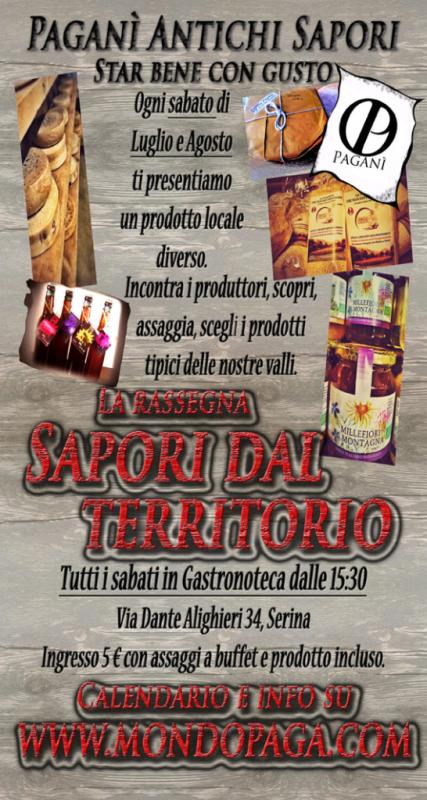 Ogni sabato di Luglio e Agosto, presso la Gastronoteca di“ Paganì Antichi Sapori” di Serina, si svolgerà la rassegna “Sapori dal territorio”.