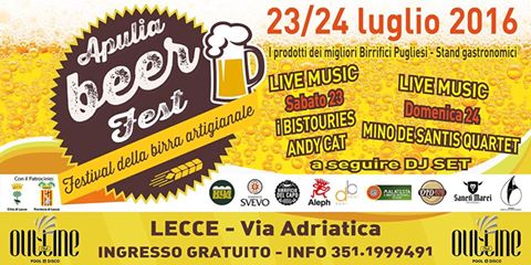 Ci siamo! E' partito il conto alla rovescia verso l'atteso primo festival della birra artigianale pugliese, l’Apulia Beer Fest, grande evento birraio, gastronomico di musica e spettacolo, in programma nella splendida Lecce, i prossimi 23 e 24 luglio 2016. La prima edizione della manifestazione, è interemente dedicata ai Micro-Birrifici e Birrifici Pugliesi e si svolgerà in una location particolare e che non ha bisogno di presentazioni particolari: l’Out Line Club, struttura di livello che accoglierà a bordo piscina e nel suo incantevole garden mediterraneo, gli stand di degustazione ed esposistivi.