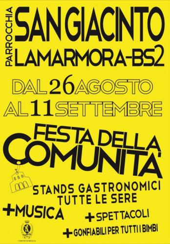 Ritorna la consueta Festa Della Comunità dell'Oratorio di San Giacinto, Brescia con stands gastronomici, musica e animazione. Novità di quest'anno: il 26/08 si terrà una serata Dj con spazio cocktail, mentre il 01/09 vi aspettiamo numerosi per il sangria party. Gli stands gastronomici non saranno aperti il lunedì e il martedì.