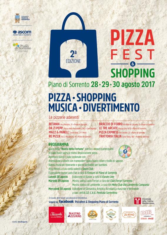 "Pizzafest&Shopping", l'evento che valorizza le eccellenze enogastronomiche e commerciali del territorio, torna a Piano di Sorrento, dopo il fortunato debutto dello scorso anno. Pronta sulla griglia di partenza l'Associazione Commercianti (Ascom) che promuove la manifestazione in collaborazione con il Centro Commerciale Naturale (Ccn) e con il patrocinio del Comune carottese. Percorsi enogastronomici, intrattenimento, musica, animazione, esibizioni sportive, mostre automobilistiche, concorsi e promozioni: questa la ricetta che ha reso "Pizzafest&Shopping" da subito l'evento clou dell'estate in penisola sorrentina.