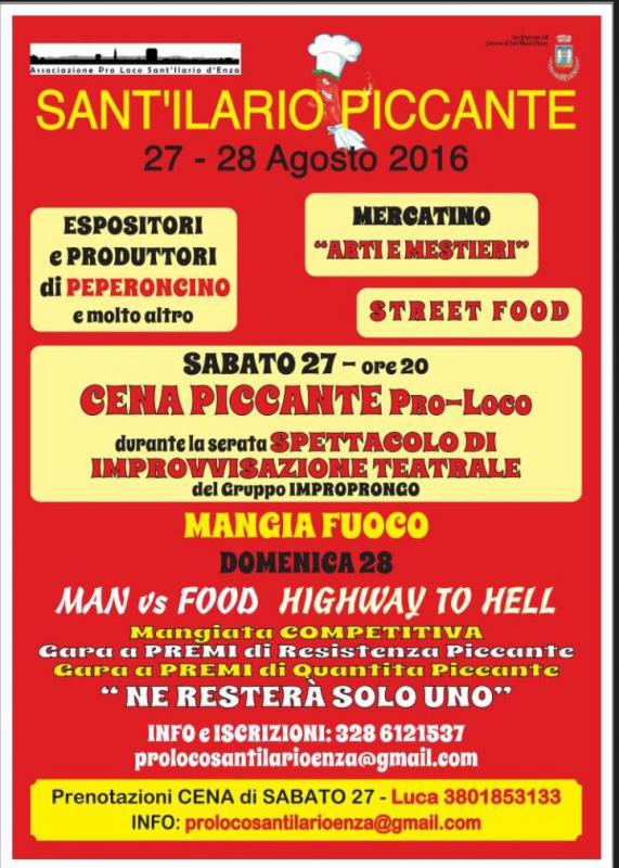 Sant'Ilario Piccante a Sant'Ialrio d'Enza il 27 e 28 agosto 2016: cena piccante con spettacolo teatrale, produttori di peperoncino, mercatino arti e mestieri, street food, mangiata competitiva e tanto altro.