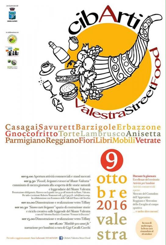Domenica 9 Ottobre Valestra, con le sue specialità culinarie e paesaggistiche, sarà la location del primo evento di CibArti. Forte delle sue origini liguri e bizantine, da anni Valestra vanta un assortimento e una tradizione di prodotti culinari e artigianali unici nel loro genere che imprenditori e associazioni locali hanno saputo conservare e valorizzare nel corso del tempo. Dal re delle polente, i casagai, al parmigiano reggiano, dall'erbazzone valestrino al savurett, dall'anisetta al gnocco fritto, dalle barzigole bizantine alle torte, dalle zuppe alla panna cotta con ambrosia. Anche i palati più fini avranno l'imbarazzo della scelta.