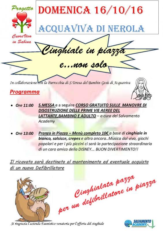 Vi aspettiamo ad Acquaviva di Nerola per una giornata da trascorrere insieme a noi, all'insega della beneficenza, infatti l'incasso sarà destinato al mantenimento ed eventuale acquisto di un nuovo defibrillatore.