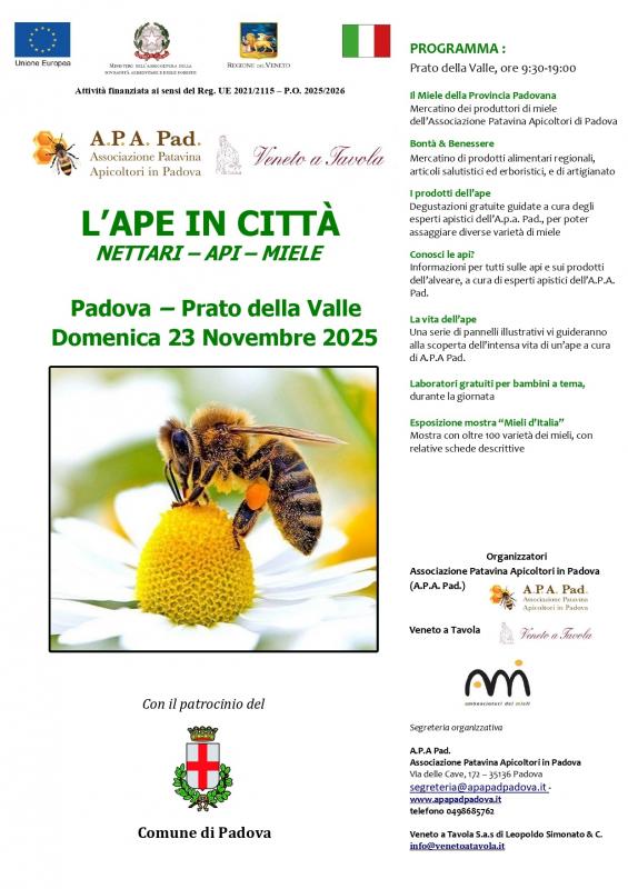 La manifestazione L’Ape in Città si svolgerà domenica 23 novembre nella splendida cornice di Prato della Valle a Padova, e sarà dedicata al miele ed ai suoi derivati. L'evento è organizzato dall'Associazione Apicoltori Patavini A.P.A. Pad. e Veneto a Tavola, con il patrocinio del Comune di Padova.