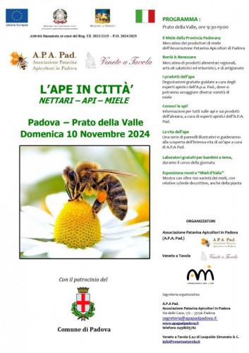 La manifestazione L’Ape in Città si svolgerà domenica 23 novembre nella splendida cornice di Prato della Valle a Padova, e sarà dedicata al miele ed ai suoi derivati. L'evento è organizzato dall'Associazione Apicoltori Patavini A.P.A. Pad. e Veneto a Tavola, con il patrocinio del Comune di Padova.
