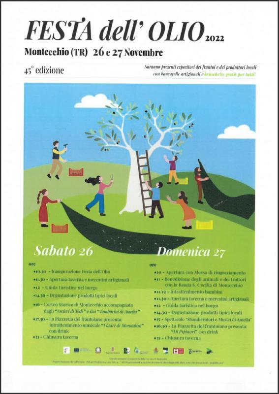 Nei giorni 26 e 27 Novembre 2022 a Montecchio si svolge la 45a Festa dell'Olio. Saranno presenti espositori dei frantoi e dei produttori locali con bancarelle artigianali e bruschette gratis per tutti.