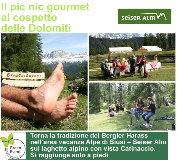 Il Ponte del 2 giugno 2017? È tempo di primavera e di pic nic! Tra le Dolomiti (Patrimonio Mondiale UNESCO) si può essere i commensali di un evento enogastronomico open air davvero speciale. È il tradizionale Bergler Harass, appuntamento per buongustai nell’area vacanze Alpe di Siusi – Seiser Alm: un pic nic gourmet sull’incantevole alpeggio di Wuhnleger, a 1.402 metri sul paese di Tires al Catinaccio, davanti alle limpide acque di un laghetto alpino al cospetto del monte Catinaccio. Ogni partecipante può assaporare i cibi contenuti in una caratteristica cassetta di legno (da cui deriva il termine harass), piena di prodotti della tradizione locale, come il formaggio di pecora, il salame di cervo, pane, burro, latte, succo di lamponi e krapfen. A rallegrare la giornata, inoltre, non manca l’intrattenimento musicale. L’alpeggio del Bergler Harass si può raggiungere solo a piedi, attraversando i boschi del Parco Naturale Sciliar Catinaccio. Anche per questo è certificato “going Green Event” dall’Agenzia provinciale per l’ambiente della Provincia Autonoma di Bolzano-Alto Adige. Si tratta cioè di un evento all’insegna della vacanza ecosostenibile.
